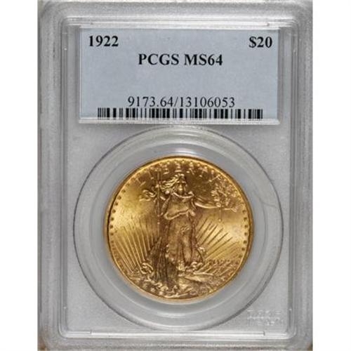 <B>1922 $20 MS64 PCGS.</B></I> PCGS Population (4673/943). NGC Census: (5547/439). Mintage: 1,375,500. Numismedia Wsl. Price for NGC/PCGS coin in MS64: $920. (#9173)<BR><BR><b>Shipping:</b> Coins & Currency (<a target="_blank" href="http://www.heritageauctions.com/common/shipping.php">view shipping information</a>)