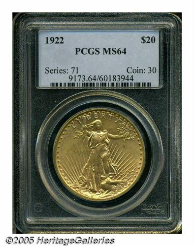 <B>1922<$20> MS64 PCGS.</B></I> Satiny luster with attractive yellow color and sharp design features. This example has prooflike tendencies.