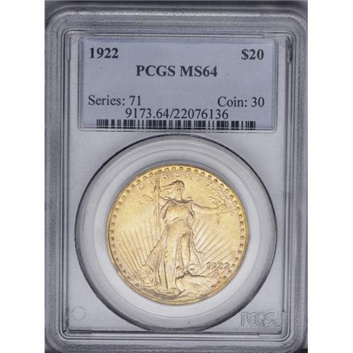 1922 $20 MS64 PCGS. Sharply struck and highly lustrous 1922[$20] MS64 PCGS.