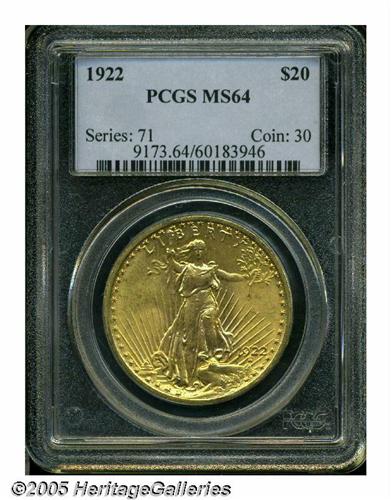 <B>1922<$20> MS64 PCGS.</B></I> The design elements are well struck, and peach-gold surfaces exude radiant luster. A couple of small marks on the central devices define the grade.