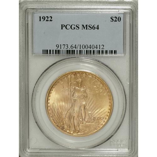 1922 $20 MS64 PCGS. The satiny, khaki surfaces exhibit