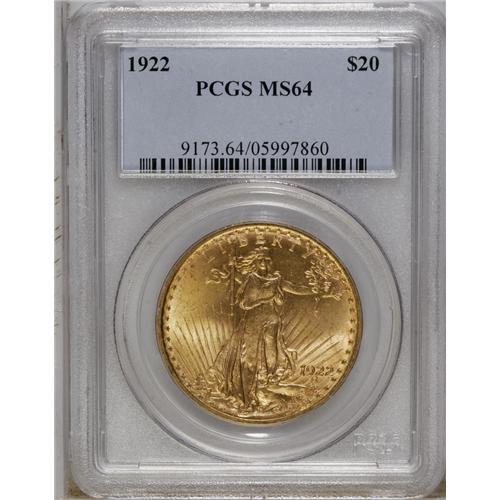 <B>1922 $20 MS64 PCGS.</B></I> This crisply struck wheat-gold piece has pretty luster. Choice and minimally marked for the grade with only a few flaws in the smooth fields.<BR><BR><b>Shipping:</b> Coin/Currency (<a target="_blank" href="http://www.heritageauctions.com/common/shipping.php">view shipping information</a>)