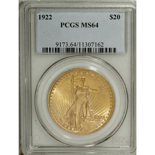 <B>1922 $20 MS64 PCGS.</B></I> This sharply struck Choice Saint-Gaudens twenty has scintillating luster and clean fields. A concealed mark on the tail feathers is far from the focal points.<BR><BR><b>Shipping:</b> Coins & Currency (<a target="_blank" href="http://www.heritageauctions.com/common/shipping.php">view shipping information</a>)
