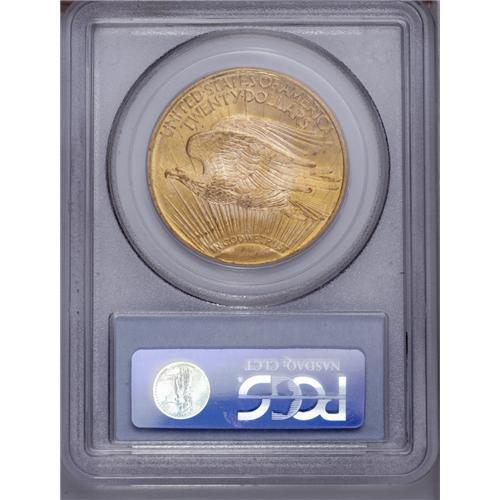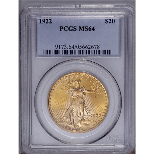 <B>1922 $20 MS64 PCGS.</B></I> Two-toned reddish-gold with a corona of lighter yellow-gold around Liberty. Satiny and lustrous surfaces with a fairly pleasing strike and a minimum of distracting abrasions.