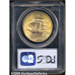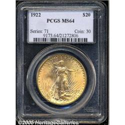 <B>1922 $20 MS64 PCGS.</B></I> Visually appealing example with mottled deep-golden coloration. Some minute nicks are noted, wholly in line with this coin's near-Gem status. A small die line - as struck - is noted in the left obverse field and an impressive die break has begun along the upper obverse periphery.