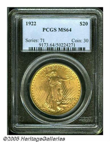 <B>1922<$20> MS64 PCGS.</B></I> Well struck, the surfaces display rich, deep orange-gold coloration and are obviously original. A lovely MS64 example of this popular P-mint from the 1920s.