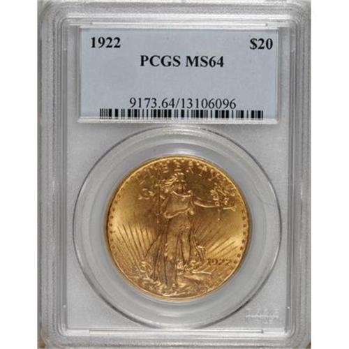 <B>1922 $20 MS64 PCGS.</B></I> The 1922 is common in relation to the 1922-S, but becomes scarce when compared with the 1923 to 1928 Philadelphia issues. This highly lustrous near-Gem has a pleasantly mark-free obverse. An interesting mint-made retained lamination is present on the reverse at 7:30.<BR><BR><b>Shipping:</b> Coins & Currency (<a target="_blank" href="http://www.heritageauctions.com/common/shipping.php">view shipping information</a>)