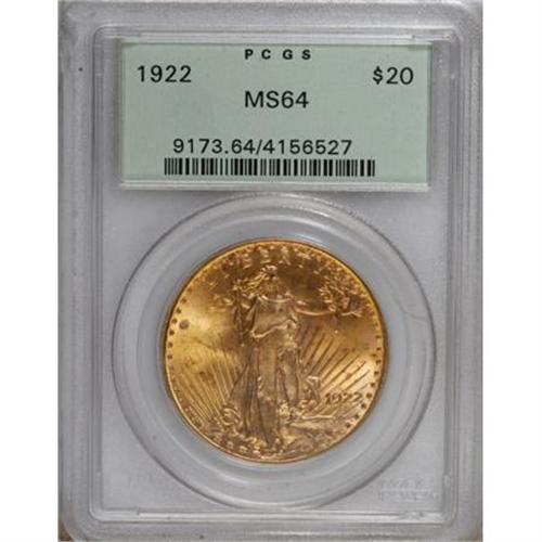 <B>1922 $20 MS64 PCGS.</B></I> PCGS Population (4673/943). NGC Census: (5575/443). Mintage: 1,375,500. Numismedia Wsl. Price for NGC/PCGS coin in MS64: $920. (#9173)<BR><BR><B>Coin Engraver:</B> Augustus Saint-Gaudens<BR><BR><b>Shipping:</b> Coins & Currency (<a target="_blank" href="http://www.heritageauctions.com/common/shipping.php">view shipping information</a>\)