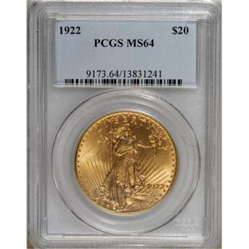 <B>1922 $20 MS64 PCGS.</B></I> PCGS Population (4673/943). NGC Census: (5575/443). Mintage: 1,375,500. Numismedia Wsl. Price for NGC/PCGS coin in MS64: $920. (#9173)<BR><BR><B>Coin Engraver:</B> Augustus Saint-Gaudens<BR><BR><b>Shipping:</b> Coins & Currency (<a target="_blank" href="http://www.heritageauctions.com/common/shipping.php">view shipping information</a>\)