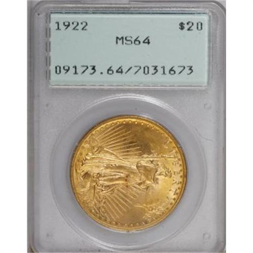 <B>1922 $20 MS64 PCGS.</B></I> This well struck and strongly lustrous Philadelphia near-Gem has hazy apricot-gold surfaces that display faint alloy spots near Liberty's waist. Housed in a first-generation PCGS holder.<BR><BR><B>Coin Engraver:</B> Augustus Saint-Gaudens<BR><BR><b>Shipping:</b> Coins & Currency (<a target="_blank" href="http://www.heritageauctions.com/common/shipping.php">view shipping information</a>)
