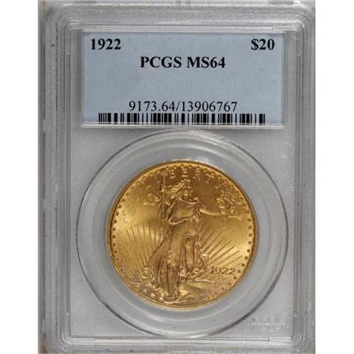 <B>1922 $20 MS64 PCGS.</B></I> PCGS Population (5122/1025). NGC Census: (5661/456). Mintage: 1,375,500. Numismedia Wsl. Price for NGC/PCGS coin in MS64: $920. (#9173)<BR><BR><B>Coin Engraver:</B> Augustus Saint-Gaudens<BR><BR><b>Shipping:</b> Coins & Currency (<a target="_blank" href="http://www.heritageauctions.com/common/shipping.php">view shipping information</a>)