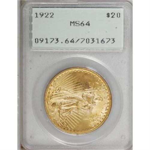 <B>1922 $20 MS64 PCGS.</B></I> . PCGS Population (5431/1066). NGC Census: (5844/477). Mintage: 1,375,500. Numismedia Wsl. Price for NGC/PCGS coin in MS64: $1,200. (#9173)<BR><BR><B>Coin Engraver:</B> Augustus Saint-Gaudens<BR><BR><b>Shipping:</b> Coins & Currency (<a target="_blank" href="http://www.heritageauctions.com/common/shipping.php">view shipping information</a>)