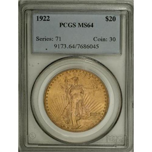 <B>1922 $20 MS64 PCGS.</B></I> PCGS Population (5664/1090). NGC Census: (5892/487). Mintage: 1,375,500. Numismedia Wsl. Price for NGC/PCGS coin in MS64: $1,235. (#9173)<BR><BR><B>Coin Engraver:</B> Augustus Saint-Gaudens<BR><BR><b>Shipping:</b> Coins & Currency (<a target="_blank" href="http://www.heritageauctions.com/common/shipping.php">view shipping information</a>)