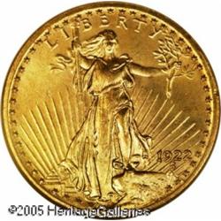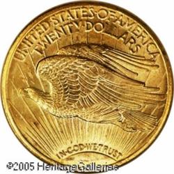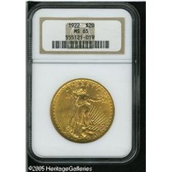 <B>1922 $20 MS65 NGC.</B></I> Boldly defined with reddish-tinged surfaces that are highly lustrous, indeed almost semi-reflective in appearance. Although relatively available in lower grades, the supply of 1922 Saints thins out rapidly at the Gem level, and is nearly impossible to find above the MS65 category. Lot:9614