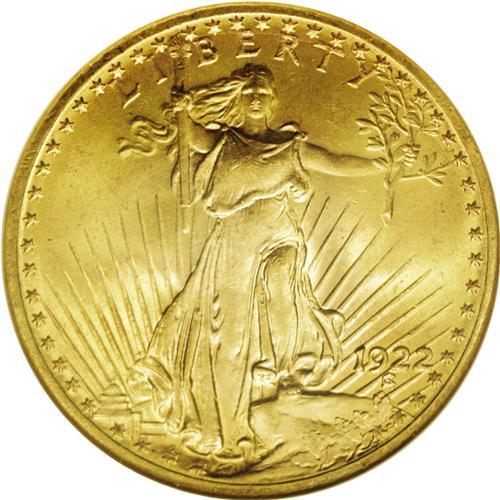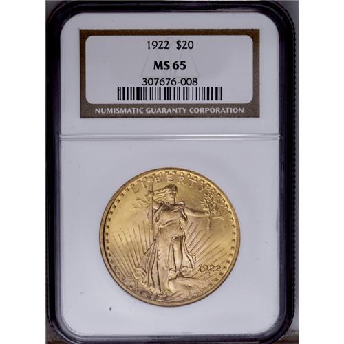 <B>1922<$20> MS65 NGC.</B></I> Deep orange-gold and rose toning adorns the surfaces of this crisply detailed, carefully preserved Gem. Only faint marks are evident, on either side of the piece. A lovely, richly lustrous example.