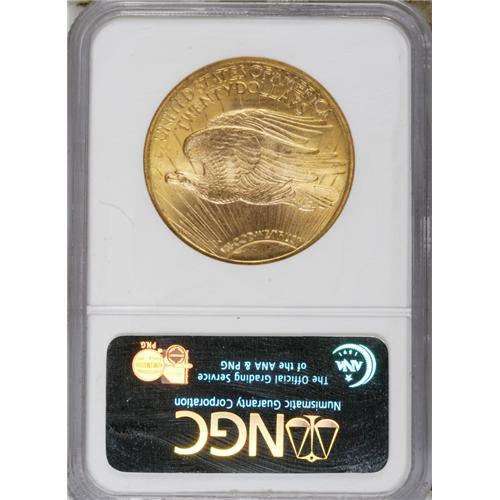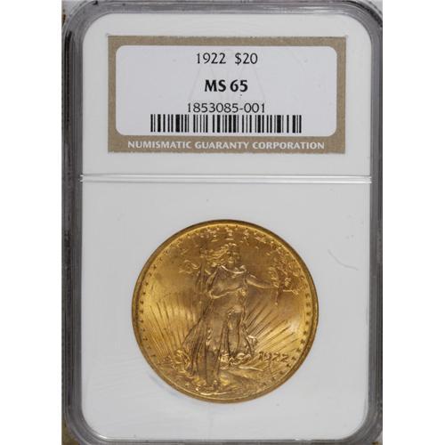 <B>1922 $20 MS65 NGC.</B></I> This softly lustrous orange-gold Gem has bounteous eye appeal and above-average detail. Clean fields only enhance the desirability. Surprisingly elusive, especially compared to certain later P-mint issues; NGC has certified only eight coins finer (1/07).<BR><BR><b>Shipping:</b> Coins & Currency (<a target="_blank" href="http://www.heritageauctions.com/common/shipping.php">view shipping information</a>)