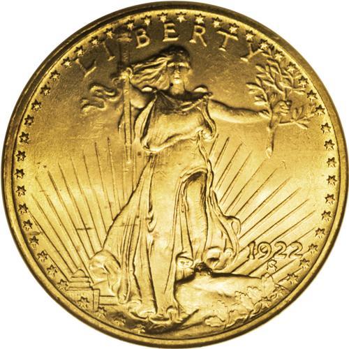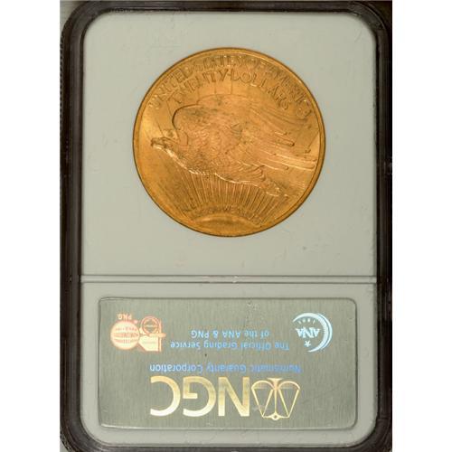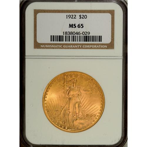 <B>1922 $20 MS65 NGC.</B></I> Well struck and slightly satiny, this straw-gold piece has a hint of orange in the reverse fields. The overall preservation is fine, though a few tiny marks and a thin, broken line of grease appear on the obverse; the latter extends horizontally from 8 o'clock to the gown. NGC has graded just nine coins finer (12/06).<BR><BR><b>Shipping:</b> Coin/Currency (<a target="_blank" href="http://www.heritageauctions.com/common/shipping.php">view shipping information</a>)