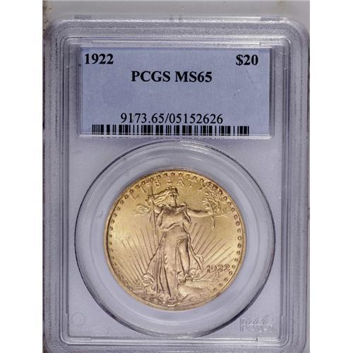<B>1922<$20> MS65 PCGS.</B></I> A wonderful Gem quality example of this populous date. Brilliant surfaces have frosty yellow-gold luster and minimal surface marks.