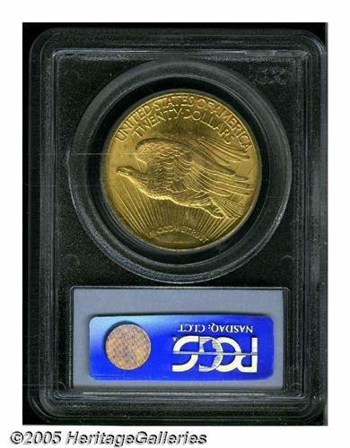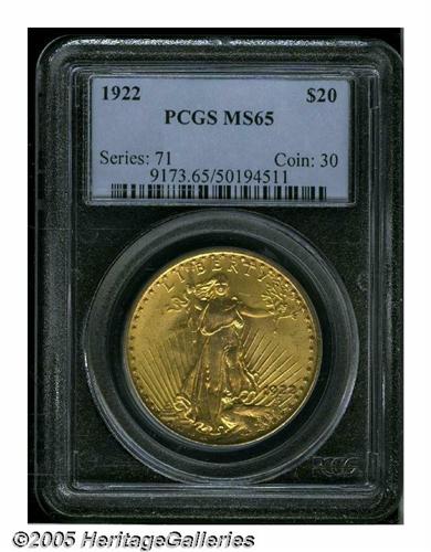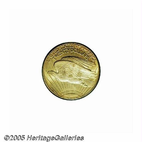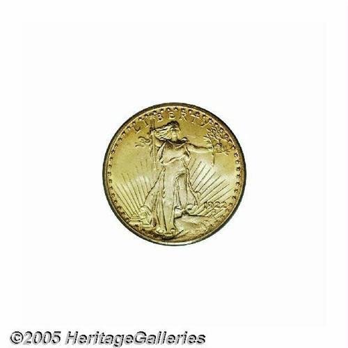 <B>1922<$20> MS65 PCGS.</B></I> Although relatively available in lower grades, the supply of 1922 Saints thins out rapidly at the Gem level, and becomes extremely difficult above the MS65 category. This is attested to by the population figures: PCGS has certified only seven pieces higher, and NGC has seen a mere three grading higher (5/05). Moreover, only two coins of this issue exceeding MS65 have appeared in major auctions over the past few years. The Gem example offered in this lot displays apricot-gold patina over fully lustrous surfaces. The design elements are well struck, including relatively strong definition on most of the Capitol Building. A few trivial marks over each side are mentioned for accuracy.
