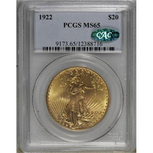 <B>1922 $20 MS65 PCGS. CAC.</B></I> This shining Gem is primarily yellow-gold with subtle peach inflections near the rims. Well-defined with a delicate die crack through the letters of LIBERTY. PCGS has graded a mere seven finer pieces (3/08).<BR><BR><B>Coin Engraver:</B> Augustus Saint-Gaudens<BR><BR><b>Shipping:</b> Coins & Currency (<a target="_blank" href="http://www.heritageauctions.com/common/shipping.php">view shipping information</a>)