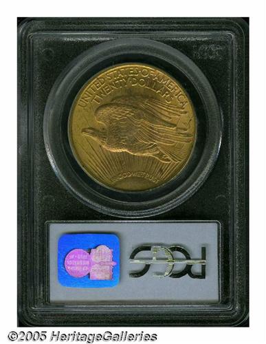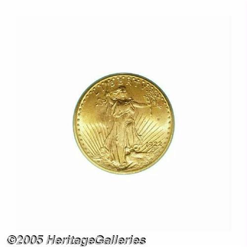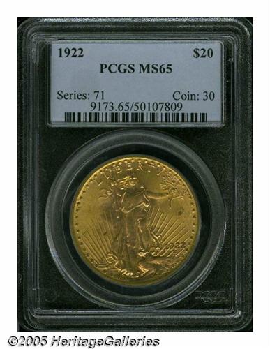 <B>1922<$20> MS65 PCGS.</B></I> Satiny with rich golden coloration and a few tiny alloy stains here and there. While not particularly scarce in Mint State, the percentage of coins that merits a Gem rating is extremely low.