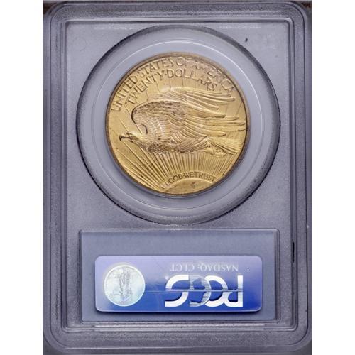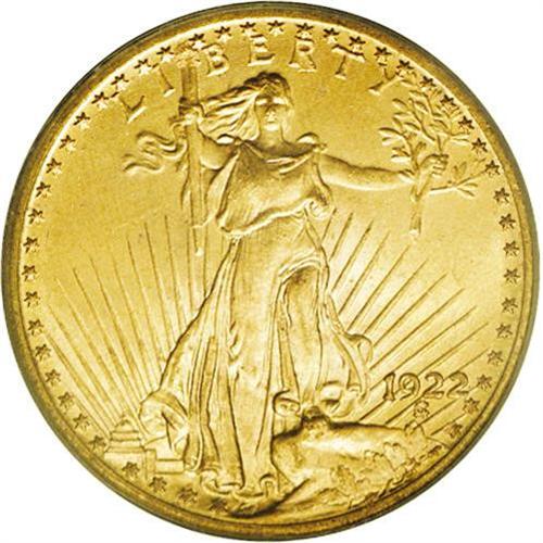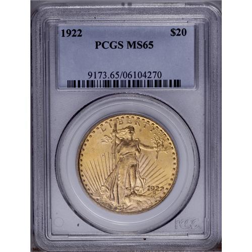<B>1922<$20> MS65 PCGS.</B></I> The 1922 double eagle, with a mintage of 1,375,500 pieces, is very common in terms of total number of Mint State coins known. David Bowers (2004) notes that vast quantities of this issue were exported in the 1920s, and did not return until after World War II. The '22 is readily available through MS64, of which PCGS and NGC have certified about 10,000 pieces. The MS65 population falls off to about 1,000 coins at both services, and only 15 pieces have graded finer (2/06). This coin displays sharply struck design elements, though the Capitol building reveals typical weakness. The surfaces emit nice luster, and are apricot-gold. A few small contact marks on each side are mentioned for accuracy.
