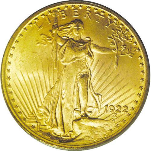 <B>1922<$20> MS65 PCGS.</B></I> The 1922 is a very common issue in terms of the total number of Mint State pieces known. PCGS and NGC have certified over 50,000 Uncirculated pieces. This lustrous Gem displays apricot-gold color and sharply struck design elements. Several small contact marks are scattered about, especially on the obverse.
