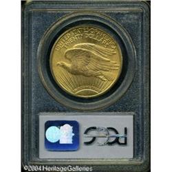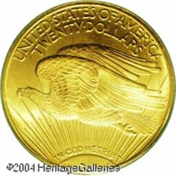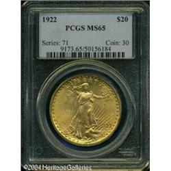 1922 $20 MS65 PCGS. This is a noteworthy coin with <B>1922 $20 MS65 PCGS.</B></I> This is a noteworthy coin with smooth surfaces and rich copper-golden color overall. A couple of small alloy spots show at the top of the obverse. While quite common in lower grades, as a Gem, this becomes a very elusive coin, and is almost impossible to locate above the MS65 level. <BR><BR><B>Important notice:</B> Heritage usually auctions material at the rate of 200-250 lots per hour. On some occasions eBay Live bid software or the Internet may not be able to keep up with the pace of the auction. We recommend placing a realistic absentee bid now as insurance to avoid disappointment. Occasionally the auctioneer may eliminate or reject an eBay Live bid, and the auctioneer may also reopen a lot after the close of the eBay live bidding (usually because we missed an audience bid), and may reject your bid even if it shows you as the winning bidder. By bidding via eBay Live, you agree that Heritage may award the lot to another bidder at its sole discretion under the circumstances described above or any other reasonable circumstances. Since eBay bids are not shown to us until we open the lot on the floor, we treat those bids just like floor bids. In most cases the floor responds before the eBay bid is presented to us, due to Internet lag time, so for consistency we have made it a policy that floor bids are always considered first over tie eBay live bids. Also please note that all Heritage lots purchased through eBay Live carry a 20% Buyer's Premium. Please make sure you read the Terms and Conditions before you bid. This lot is being auctioned in conjunction with a live floor auction by Heritage Galleries & Auctioneers. All final auction and invoice information will be supplied by Heritage Galleries & Auctioneers, and all other information should be considered preliminary. Lot:7182