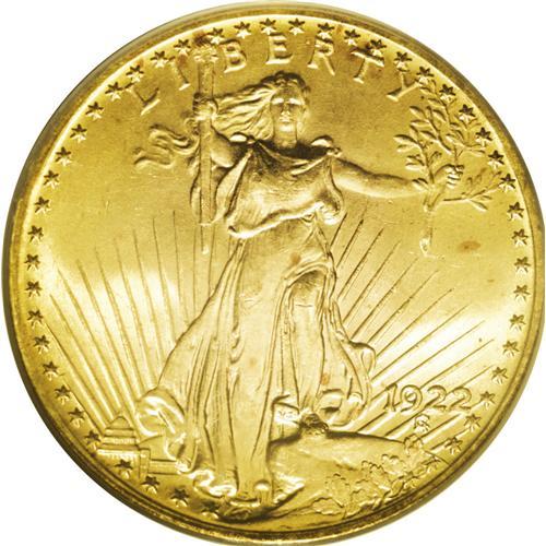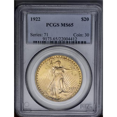 <B>1922<$20> MS65 PCGS.</B></I> This penetratingly struck Gem has dazzling luster and medium tan-gold patina. The fields are impressively smooth, and the eye appeal is superior for the grade. A few small rose alloy spots require no further discussion. PCGS has certified only seven pieces finer as of (6/06).