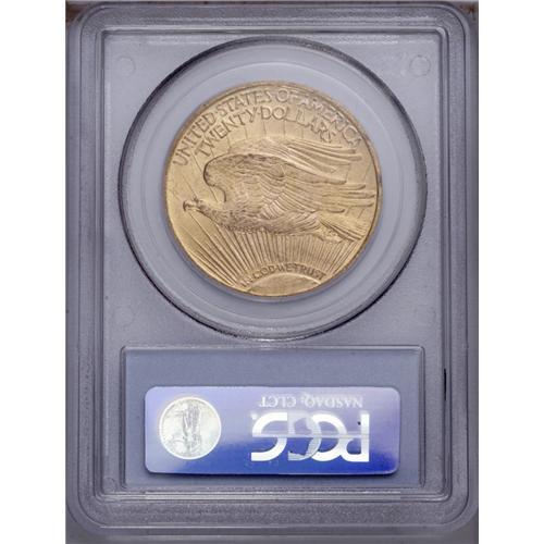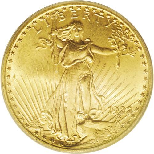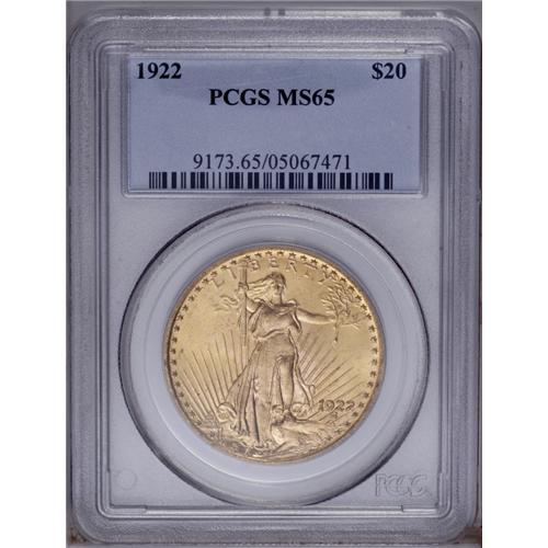 <B>1922<$20> MS65 PCGS.</B></I> This sharply struck Gem displays apricot-gold patination imbued with subtle traces of light green. A few marks are noted, as is consistent with the grade level. A small scrape on the Capitol building is mentioned for accuracy. PCGS has seen only seven pieces grading higher (1/06).