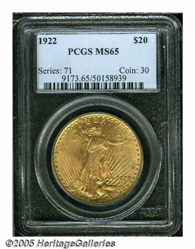 <B>1922<$20> MS65 PCGS.</B></I> Well struck with gleaming satin luster and lovely pastel pink-orange and mint-green toning. Other than a pair of small abrasions on the lower reverse, the carefully preserved surfaces are distraction-free. Plentiful in lower grades, the '22-P is not easy to find at the Gem grade level or higher.