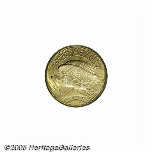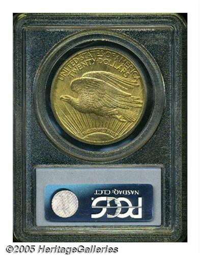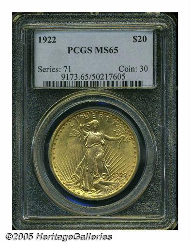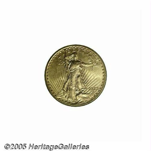 <B>1922<$20> MS65 PCGS.</B></I> With a mintage of nearly 1.4 million pieces, the 1922-P is fairly common in the lower grades of Mint State. Full Gems become difficult, and coins above MS65 are rare. Indeed, only ten examples grading higher have been seen by PCGS and NGC combined (5/05). The present coin is sharply struck, except that portions of the Capitol Building reveal minor softness, and the lustrous surfaces present a greenish-gold patina. A couple of minute contact marks on Liberty's chest and on some of the letters of the reverse legend are mentioned for accuracy. Also, a fine crack though AMERICA is of undetermined origin.
