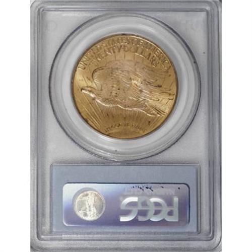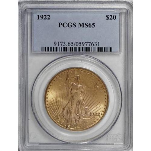 <B>1922 $20 MS65 PCGS.</B></I> Rich khaki-gold patina embraces this vibrantly lustrous and boldly struck Gem. Only lightly abraded, although a few minor rose and ebony alloy spots are present. Perhaps two dozen times scarcer than the 1924 in the MS65 grade.<BR><BR><b>Shipping:</b> Coins & Currency (<a target="_blank" href="http://www.heritageauctions.com/common/shipping.php">view shipping information</a>)