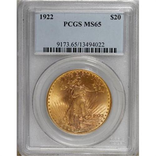 <B>1922 $20 MS65 PCGS.</B></I> While the 1922 is available in Gem, anything finer is a condition rarity. This carefully preserved apricot-gold example, strongly lustrous with a hint of satin on the solidly struck obverse devices, offers plenty of eye appeal.<BR><BR><B>Coin Engraver:</B> Augustus Saint-Gaudens<BR><BR><b>Shipping:</b> Coins & Currency (<a target="_blank" href="http://www.heritageauctions.com/common/shipping.php">view shipping information</a>)