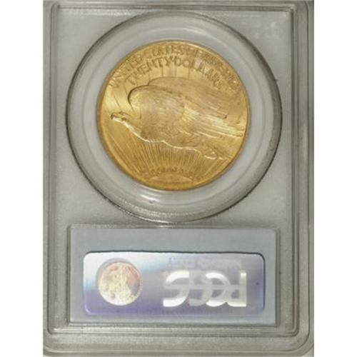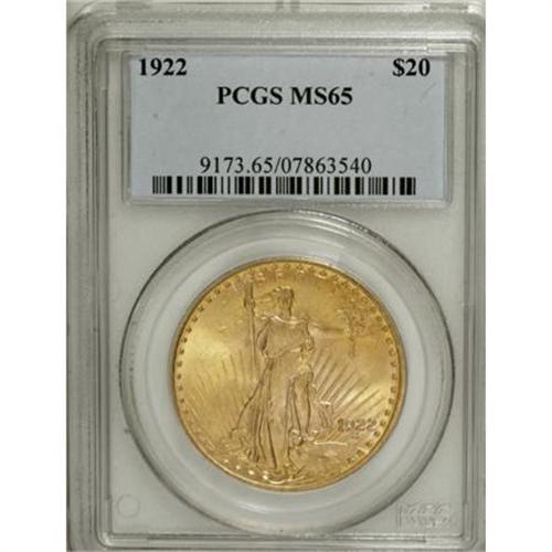 <B>1922 $20 MS65 PCGS.</B></I> This Gem showcases lovely green-gold surfaces with abundant cartwheel luster. The strike is crisp, although the reverse shows a few light abrasions below the eagle. An attractive example of this overlooked issue, conditionally rare any finer, with just seven such pieces graded by PCGS (7/07).<BR><BR><B>Coin Engraver:</B> Augustus Saint-Gaudens<BR><BR><b>Shipping:</b> Coins & Currency (<a target="_blank" href="http://www.heritageauctions.com/common/shipping.php">view shipping information</a>)