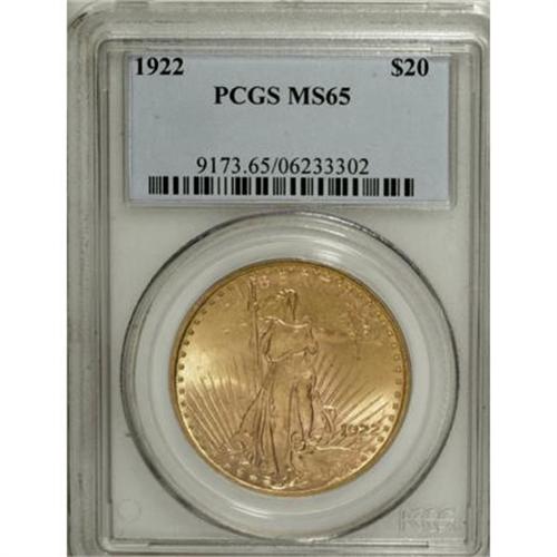 <B>1922 $20 MS65 PCGS.</B></I> A slightly better date in Gem condition, and this representative has strong luster, a good strike, and bold visual appeal. The peach-inflected surfaces show just a few minor flaws, and with only seven higher-graded pieces at PCGS (8/07), it is rare any finer.<BR><BR><B>Coin Engraver:</B> Augustus Saint-Gaudens<BR><BR><b>Shipping:</b> Coins & Currency (<a target="_blank" href="http://www.heritageauctions.com/common/shipping.php">view shipping information</a>)