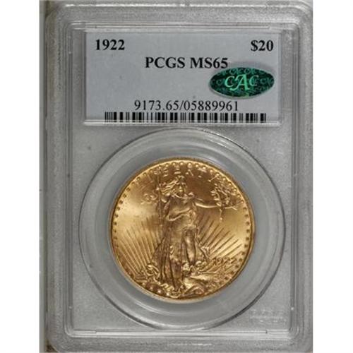 <B>1922 $20 MS65 PCGS. CAC. </B></I> Sharply struck, with lustrous peach-gold surfaces. Well preserved for the grade designation. While readily available in MS65, higher grade pieces are elusive.<BR><BR><B>Coin Engraver:</B> Augustus Saint-Gaudens<BR><BR><b>Shipping:</b> Coins & Currency (<a target="_blank" href="http://www.heritageauctions.com/common/shipping.php">view shipping information</a>)