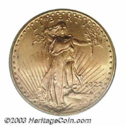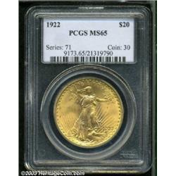 <TABLE cellSpacing=0 cellPadding=0 width="100%" bgColor=#000000 border=0><TBODY><TR><TD width="100%"><TABLE cellSpacing=1 cellPadding=3 width="100%" border=0><TBODY><TR><TD width="100%" bgColor=#79735c><FONT face=arial color=#ffffff size=3><B>Description</B> </FONT></TD></TR><TR><TD width="100%" bgColor=#ffffff><FONT face=arial size=2><B>1922 $20 MS65 PCGS.</B></I> The 1922 is a slightly better P-mint from this decade, and it is especially noteworthy in Gem condition. Only 95 pieces have been so graded by PCGS with three finer (8/03). This is a very pleasing, frosted example that shows no obvious or distracting abrasions, just a couple of tiny grease stains that were struck into the coin's surface at the time of manufacture close to 9 o'clock.<BR><I>From the Davis Collection.</B></I> </FONT></TD></TR></TBODY></TABLE></TD></TR></TBODY></TABLE><BR><A name=PricesRealized></A><TABLE cellSpacing=0 cellPadding=0 width="100%" bgColor=#000000 border=0><TBODY><TR><TD width="100%"><TABLE cellSpacing=1 cellPadding=3 width="100%" border=0><TBODY><TR><TD width="100%" bgColor=#79735c><A name=PR><FONT face=arial color=#ffffff size=3><B>Previous Prices from Heritage Auctions</B> </FONT></A></TD></TR><TR><TD bgColor=#f6f6ed><TABLE cellSpacing=0 cellPadding=0 width="100%" border=1><TBODY><TR><TD align=middle width="33%"><B>Date</B></TD><TD align=middle width="33%"><B>Service</B></TD><TD align=middle width="33%"><B>Price</B></TD></TR><TR bgColor=whitesmoke><TD width="33%"><B>03/01/2001</B></TD><TD width="33%">NGC</TD><TD width="33%">$2,070.00</TD></TR><TR bgColor=whitesmoke><TD width="33%"><B>02/12/2002</B></TD><TD width="33%">NGC</TD><TD width="33%">$2,817.50</TD></TR><TR bgColor=whitesmoke><TD width="33%"><B>06/02/1995</B></TD><TD width="33%">NGC</TD><TD width="33%">$2,090.00</TD></TR><TR bgColor=whitesmoke><TD width="33%"><B>01/11/2000</B></TD><TD width="33%">NGC</TD><TD width="33%">$2,700.00</TD></TR><TR bgColor=whitesmoke><TD width="33%"><B>02/23/2001</B></TD><TD width="33%">NGC</TD><TD width="33%">$1,840.00</TD></TR><TR bgColor=whitesmoke><TD width="33%"><B>05/22/2001</B></TD><TD width="33%">PCGS</TD><TD width="33%">$2,800.00</TD></TR><TR bgColor=whitesmoke><TD width="33%"><B>02/22/1997</B></TD><TD width="33%">PCGS</TD><TD width="33%">$2,530.00</TD></TR><TR bgColor=whitesmoke><TD width="33%"><B>07/01/1993</B></TD><TD width="33%">PCGS</TD><TD width="33%">$3,740.00</TD></TR><TR bgColor=whitesmoke><TD width="33%"><B>05/01/1999</B></TD><TD width="33%">NGC</TD><TD width="33%">$2,860.00</TD></TR><TR bgColor=whitesmoke><TD width="33%"><B>01/13/2003</B></TD><TD width="33%">NGC</TD><TD width="33%">$2,751.95</TD></TR><TR bgColor=whitesmoke><TD width="33%"><B>11/01/1998</B></TD><TD width="33%">NGC</TD><TD width="33%">$2,530.00</TD></TR><TR bgColor=whitesmoke><TD width="33%"><B>07/29/2003</B></TD><TD width="33%">NGC</TD><TD width="33%">$3,220.00</TD></TR></TBODY></TABLE></TD></TR><TR><TD bgColor=#ffffff><FONT face=arial size=1 ?>PLEASE NOTE: All prices realized reflect the final hammer price PLUS the buyer's premium in auctions that charge a buyer's premium. Each item has a notation at the top of the listing indicating whether that lot included a buyer's premium. Example: A item that sells with a final hammer price of $100 and a 20% buyer's premium will display with a price realized of $120. All information listed is intended to be as accurate as possible, but errors are possible. Please use this guide carefully and inform us of any inaccuracies. </FONT></TD></TR></TBODY></TABLE></TD></TR></TBODY></TABLE><BR><TABLE cellSpacing=0 cellPadding=0 width="100%" bgColor=#000000 border=0><TBODY><TR><TD width="100%"><TABLE cellSpacing=1 cellPadding=3 width="100%" border=0><TBODY><TR><TD width="100%" bgColor=#79735c colSpan=6><FONT face=arial color=#ffffff size=3><B>Price Guide*</B> </FONT></TD></TR><TR bgColor=#f6f6ed><TD align=middle><B>Grade</B> </TD><TD align=middle><B>Coin World<BR>(Trends)</B> </TD><TD align=middle><B>Numismedia<BR>Retail</B> </TD><TD align=middle><B>Numismedia<BR>Wholesale</B> </TD><TD align=middle><B>Coin<BR>Universe</B> </TD><TD align=middle><B>Heritage<BR>Value Index</B> </TD></TR><TR bgColor=#ffffff><TD align=middle>64</TD><TD align=right>$650.00</TD><TD align=right>$730.00</TD><TD align=right>$585.00</TD><TD align=right>$865.00</TD><TD align=right>$564.13</TD></TR><TR style="FONT-WEIGHT: bold" bgColor=#cccfdd><TD align=middle>65</TD><TD align=right>$4,100.00</TD><TD align=right>---</TD><TD align=right>$3,125.00</TD><TD align=right>$4,750.00</TD><TD align=right>$3,007.25</TD></TR><TR bgColor=#ffffff><TD align=middle>66</TD><TD align=right>---</TD><TD align=right>---</TD><TD align=right>---</TD><TD align=right>---</TD><TD align=right>$12,500.00</TD></TR><TR bgColor=#ffffff><TD colSpan=6><FONT size=1>*All information listed is intended to be as accurate as possible, but errors are possible. No item may be returned or refused based on this information which is provided as a service to our customers. You should contact each pricing source directly to determine the accuracy of this information. </FONT></TD></TR></TBODY></TABLE></TD></TR></TBODY></TABLE><BR><TABLE cellSpacing=0 cellPadding=0 width="100%" bgColor=#000000 border=0><TBODY><TR><TD width="100%"><TABLE cellSpacing=1 cellPadding=3 width="100%" border=0><TBODY><TR><TD width="100%" bgColor=#79735c><FONT face=arial color=#ffffff size=3><B>Population Guide</B> </FONT></TD></TR><TR bgColor=#ffffff><TD align=middle><!-- Begin Output of Population Grid--><TABLE cellSpacing=0 cellPadding=0 width="100%" border=0><TBODY><TR><TD vAlign=center><TABLE cellSpacing=0 width="100%" border=1 cellsadding="3"><TBODY><TR><TD vAlign=center><TABLE cellSpacing=0 cellPadding=3 width="100%" border=1><TBODY><TR><TD vAlign=center align=middle bgColor=#f0f1e8 colSpan=2 <CENTER><FONT face=Arial size=2><B>PCGS Pop </B></FONT><CENTER></CENTER></TD><TD vAlign=center align=middle bgColor=#f0f1e8 colSpan=2><CENTER><FONT face=Arial size=2><B>NGC Pop</B></CENTER></FONT></TD></