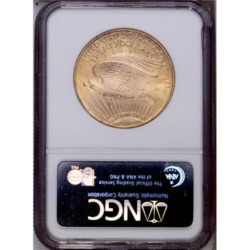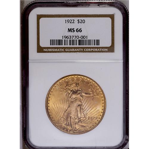 <B>1922<$20> MS66 NGC.</B></I> A pleasing blanket of deep red-gold adorns the obverse, while the reverse displays lovely red-gold and straw-gold toning. Both sides are well preserved and fully lustrous, and the striking details are bold. A common issue in the lower Mint State grades, the 1922 is scarce in MS65 and nearly unobtainable any finer. The two major services have graded only 15 specimens as fine as this Premium Gem (2/06).