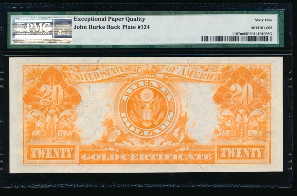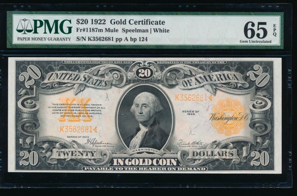 One 1922 $20 Mule Gold Certificate PMG 65EPQ.