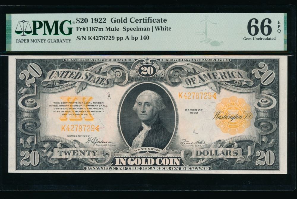 One 1922 $20 Mule Gold Certificate PMG 66EPQ.