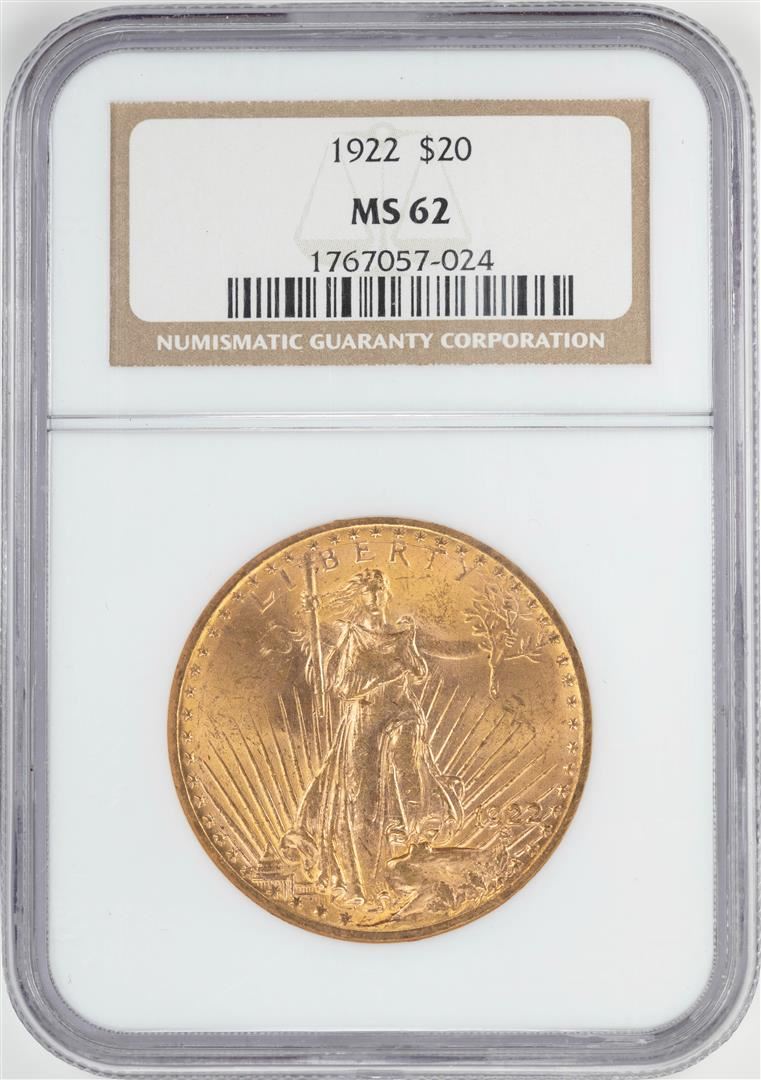One 1922 $20 St. Gaudens Double Eagle Gold Coin NGC MS62. NGC Certified.