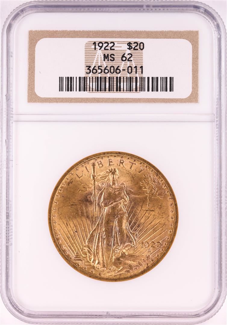 One 1922 $20 St. Gaudens Double Eagle Gold Coin NGC MS62. NGC Certified.