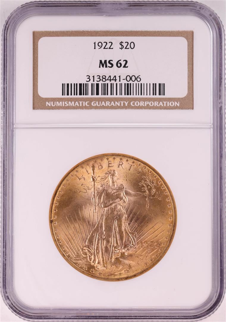 One 1922 $20 St. Gaudens Double Eagle Gold Coin NGC MS62. NGC Certified.