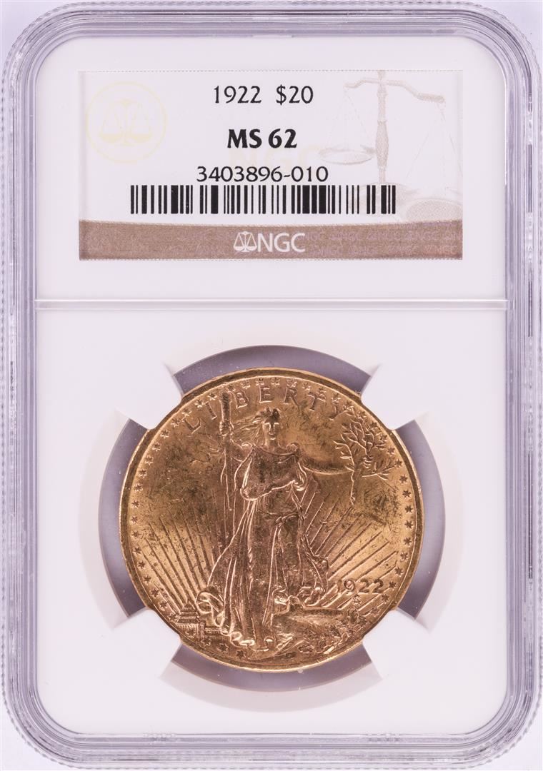 One 1922 $20 St. Gaudens Double Eagle Gold Coin NGC MS62.