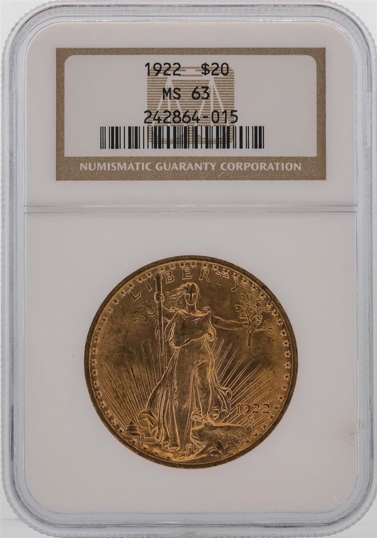 One 1922 $20 St. Gaudens Double Eagle Gold Coin NGC MS63. NGC Certified.