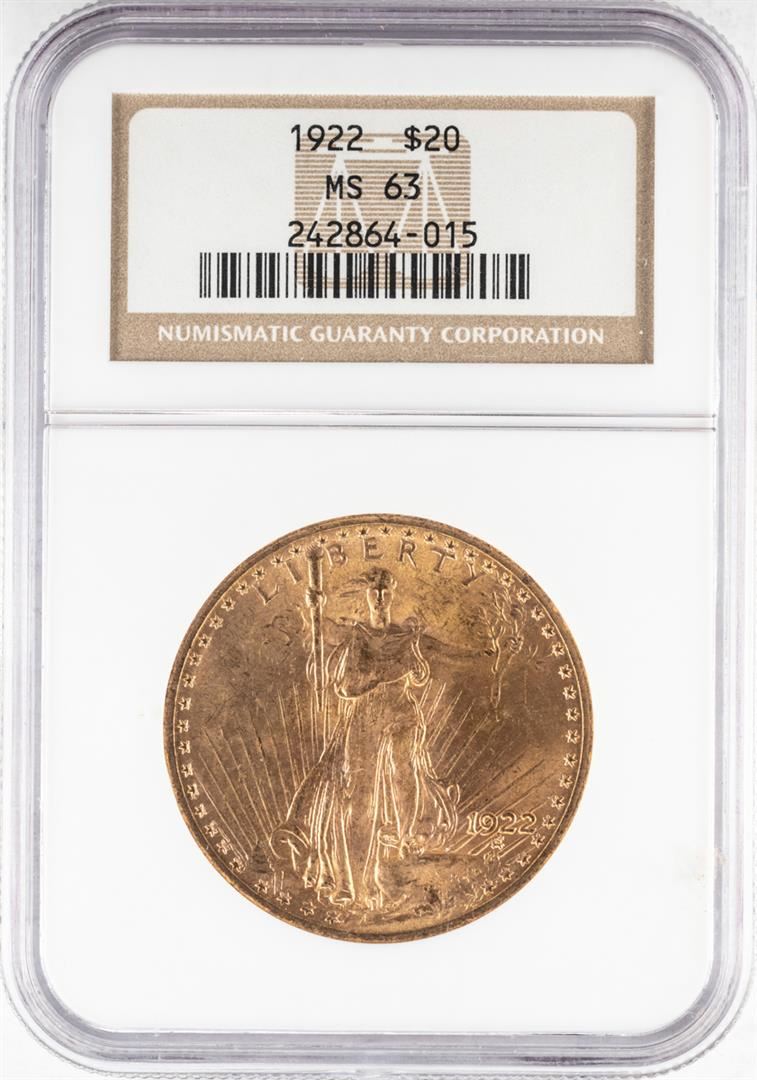 One 1922 $20 St. Gaudens Double Eagle Gold Coin NGC MS63. NGC Certified.