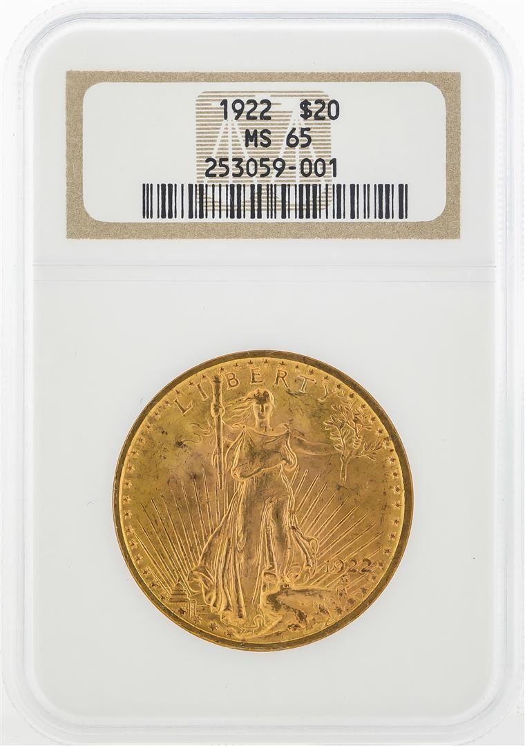 One 1922 $20 St. Gaudens Double Eagle Gold Coin NGC MS65. NGC Certified.