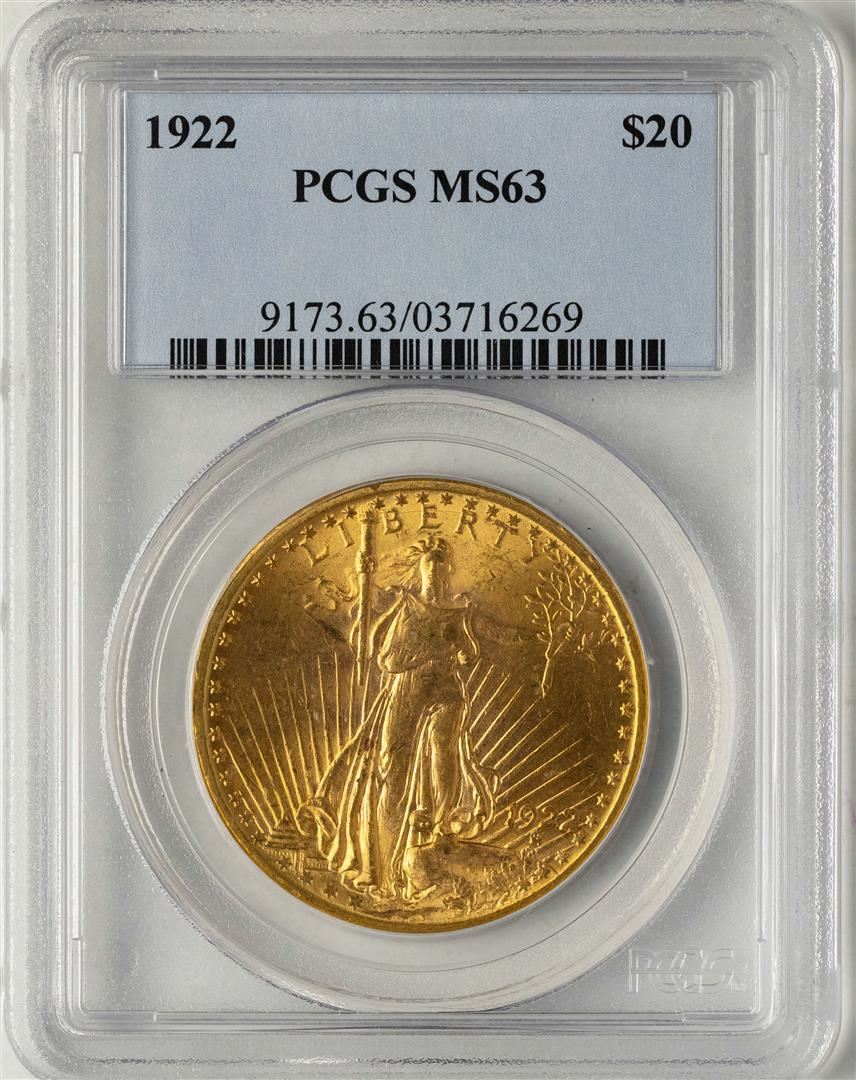 One 1922 $20 St. Gaudens Double Eagle Gold Coin PCGS MS63. PCGS Graded.