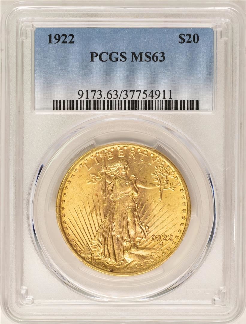 One 1922 $20 St. Gaudens Double Eagle Gold Coin PCGS MS63. PCGS Graded.